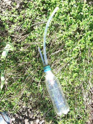 A picture of a home made pooter made from a plastic bottle and two tubes.
